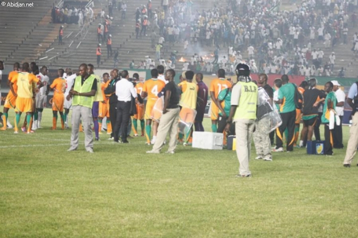 Le Sénégal a joué ce samedi contre la Côte d’Ivoire le match retour comptant pour les qualifications directes pour la Coupe d’Afrique des Nations (Can) 2013 en Afrique du Sud. Les Lions de la Teranga (Hospitalité) ont perdu par deux buts à zéro face aux Eléphants. Pour la petite histoire, c’est un match qui s’est joué seulement sur 73 minutes, au lieu de 90. Il a été interrompu après que l’arbitre a accordé un pénalty à l’équipe ivoirienne qui, par cette occasion, a aggravé le score. Des supporters Sénégalais, piqués je ne sais par quelle mouche, ont commencé à jeter des projectiles et autres bouteilles et canettes vides sur la pelouse. Les plus téméraires sont allés même jusqu’à déclencher un incendie sur les gradins qui se trouvent du côté de la tribune découverte.